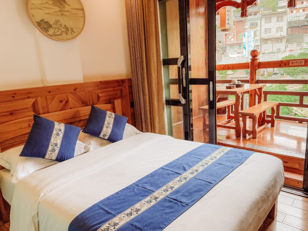 We loved and recommend our hotel here. The host was excellent and the room was not only comfortable but had a gorgeous balcony overlooking the river! You can check it out here-Floral HotelยทFurong Town Qichi Hotel (Great Waterfall Branch)