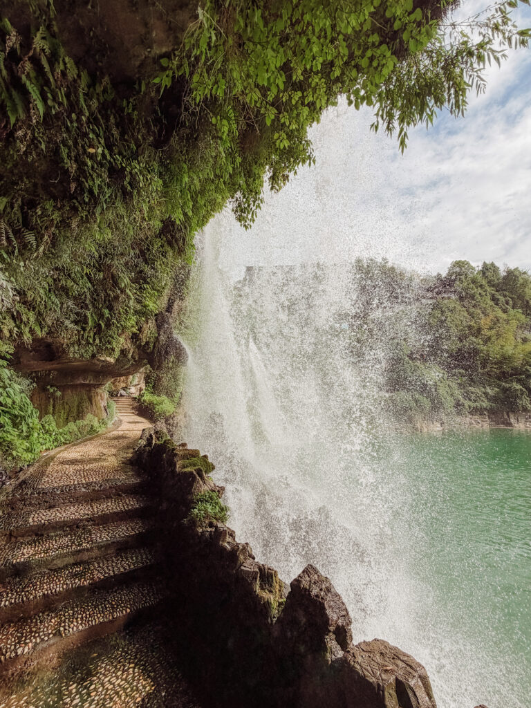 This is the unique little secret that lies behind the waterfall. As you follow the steps behind the waterfall youโ€™ll come across a  cave that was used by the indigenous Tujia people as a place to live. It has become smaller over time due to silt build up and there are statues and information boards here to explain how they lived.