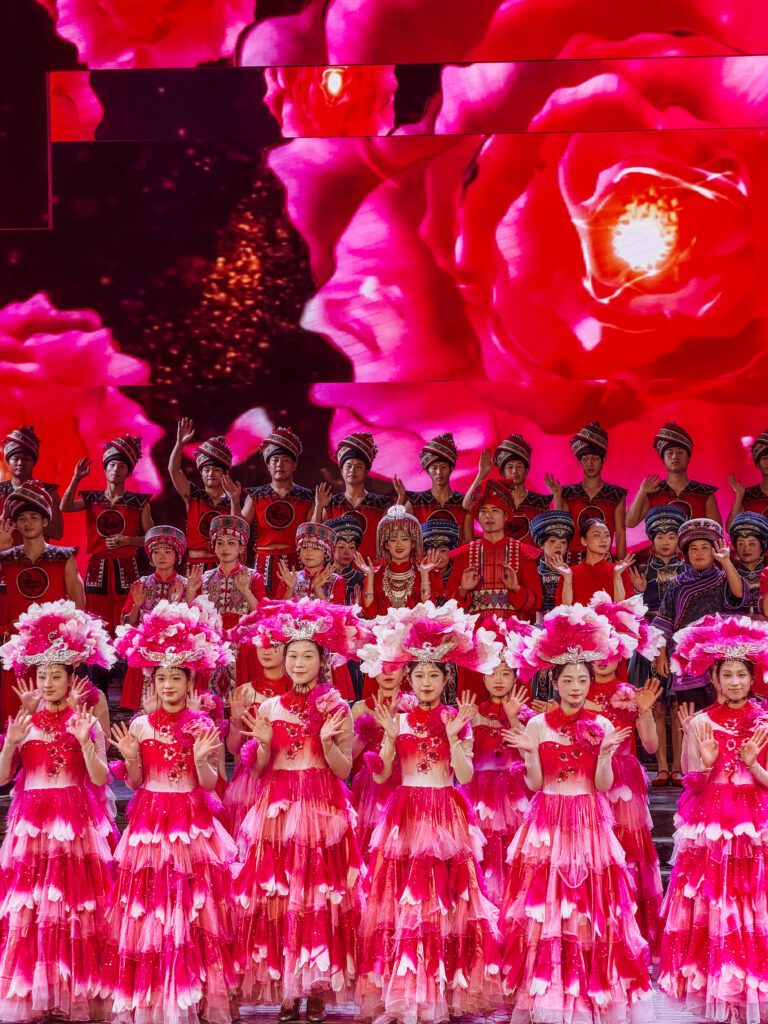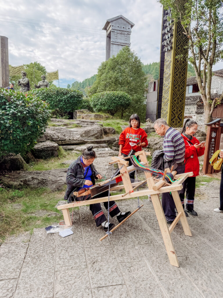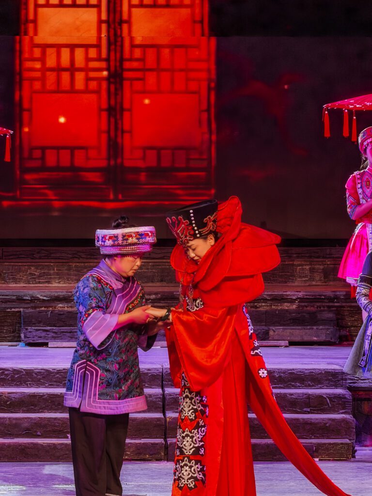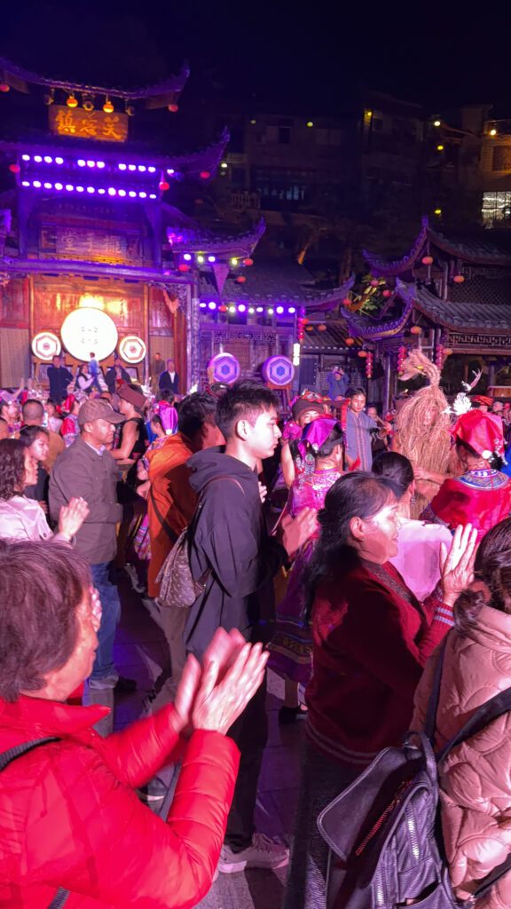 This is the Tujia Hand-Waving Hall which was the gathering spot used for celebrations, rituals, and communal dancing. It is directly through the main entrance to the old town and the location of the first show.