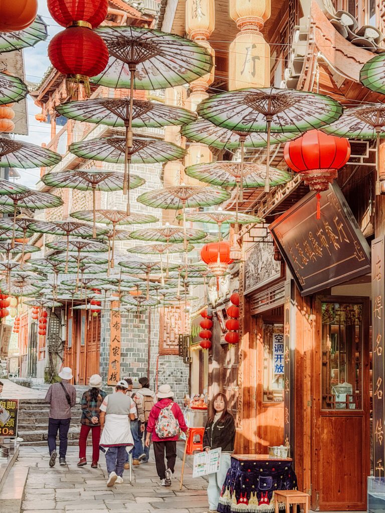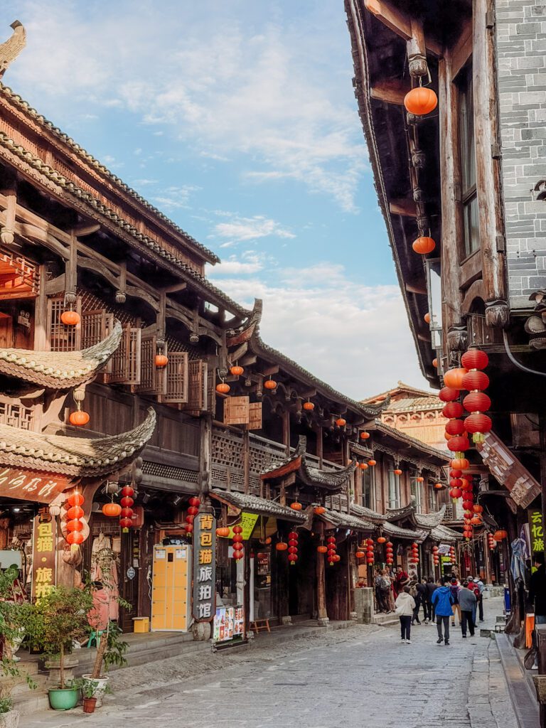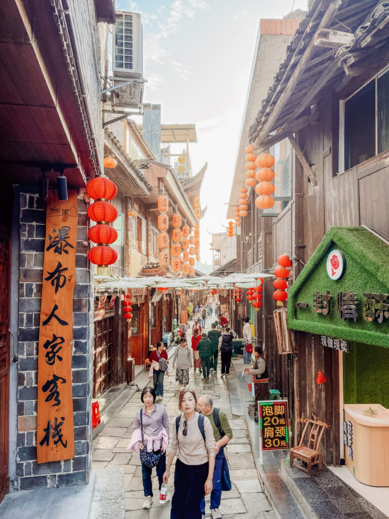 The prosperous historic commercial street and thoroughfare. Lined with Tujia stilted houses and shops itโ€™s where merchants would bring up their horses and donkeys laden with food from the port. The old bluestone slabs are smooth with years of use by these traders coming here for business. There are shops here that are great to browse and lots of restaurants with excellent views over the waterfall for your lunch or dinner.