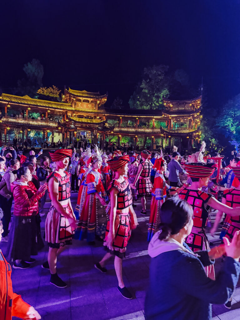 An absolute must do in Furong town and conveniently included in your ticket are 2 performances. The first starts at 7:30pm at Baishou Hall (right near where you entered). We got there a little early at 7pm and the seats were half full. We joined a family and watched the show which began with a calligraphy demonstration and auction. It was followed by a dancing performance which was pretty spectacular, showing the Tujia people throughout the ages. The dancers were excellent as was the music. This was my favourite performance and a must see. It ended with the audience being invited to join the dancers up in the centre which of course we did. We all danced around following the moves of the dancers with lots of grins and laughter.