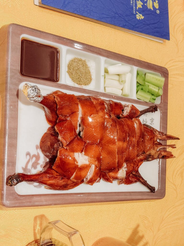 This duck is the Peking duck of the south. The small ducks are roasted in clay pots over pine needles after being basted in honey. Itโ€™s downright delicious and so tender! The famous restaurant is located a long 30km from Kunming but they also have a branch in the city! We went here for a duck (one of Mikes favourites!) and it was excellent. For 50CNY we got a roasted duck (upgrade to a fine quality duck for 60CNY) accompanied with cucumber, spring onion, a rich sauce as well as salt and pepper to sprinkle.