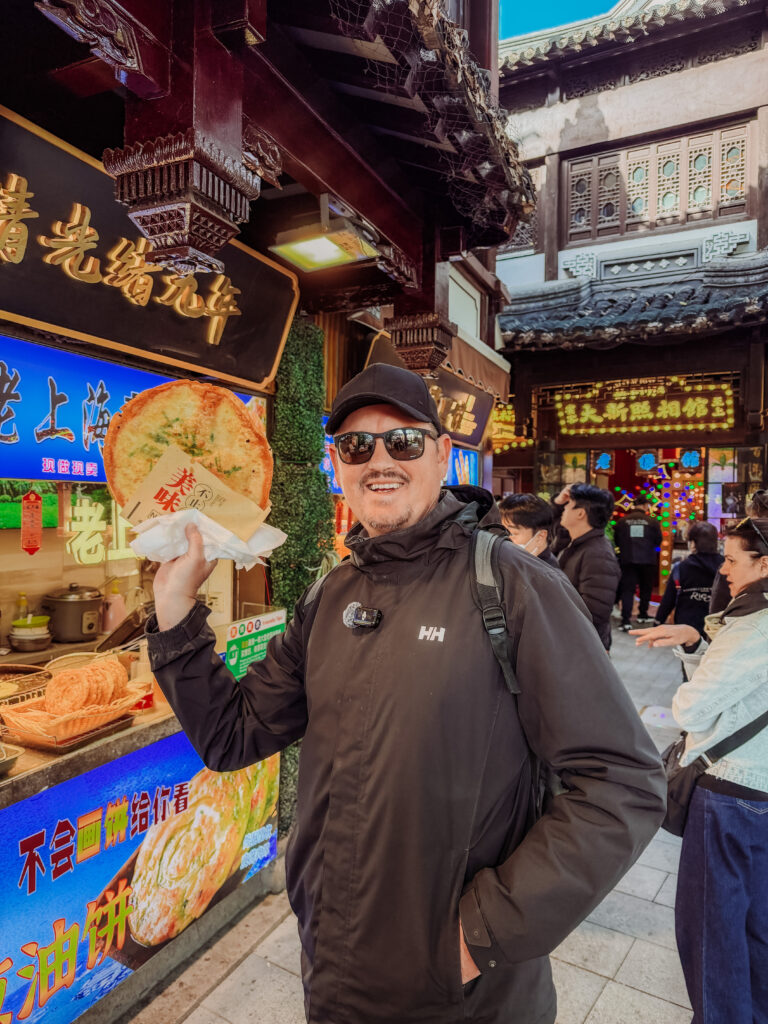 Behind Yu Garden Mike grabbed a snack of the famous Shanghai crispy scallion pancake. It was the size of his head and only 15CNY. Locals were lining up for them and they were flying out of the stall.