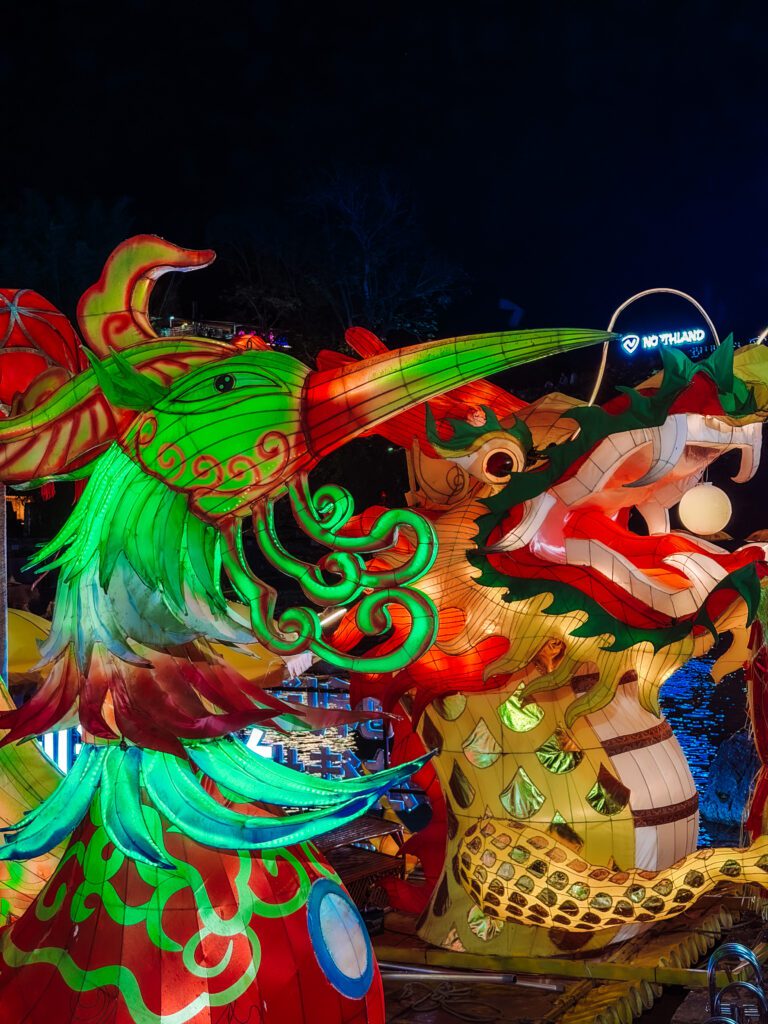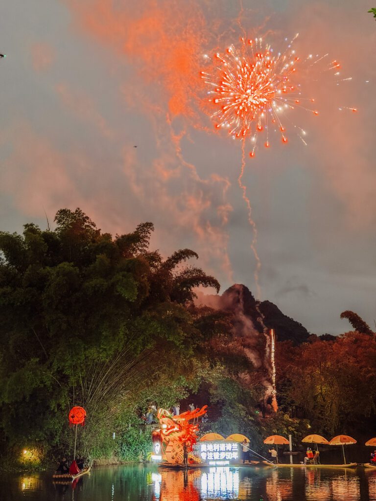 This Dragon show is a must see if youโre lucky enough to be here on a Saturday. We came back up to the bridge just in time, arriving at 6pm for the 6:10pm start! The tickets to stand on the bridge (the best viewpoint) are expensive and book out months in advance but you can stand on the side of the river for free. We joined the crowd and watched as a lantern dragon boat lead loads of bamboo rafts full of people snaking their way along the river and under the bridge. As the y came toward the bridge hundreds of fireworks exploded above us adding to the spectacle.