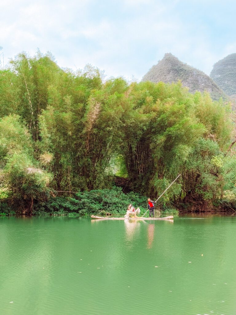 The only caveat to this is that there is a weight limit and if youโre combined weight with 2 passengers and your day packs is over 160kg then you canโt go, which is sadly what happened to us! Trust me there is nowhere and no-one that will let you on a bamboo raft if the combined weight is over 160kg. We asked everyone and even saw a local couple turned away for being 1.5kg over! Sadly we had already bought a ticket and got weighed when we were about to board. They refunded the ticket but we were so disappointed! If this weight limit applies to you then do a bamboo raft on the Li river from Yangshaou town or XingPing that is motorised and has a bigger weight rating.